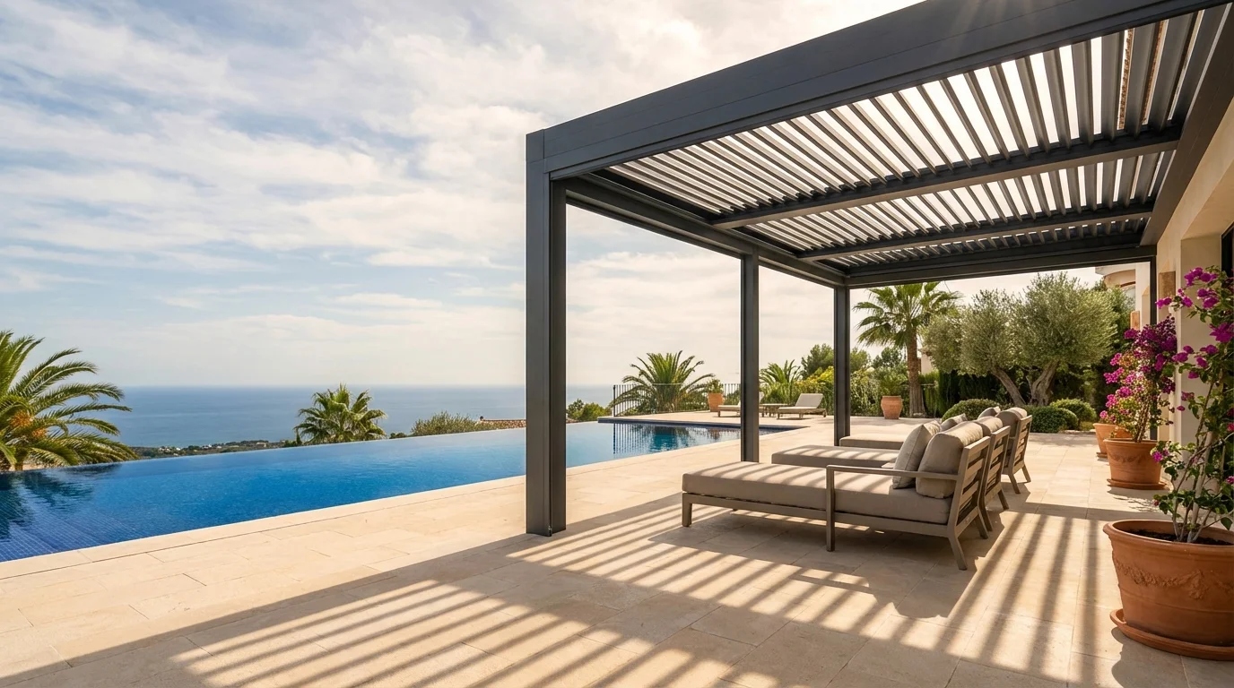 Pérgolas bioclimáticas motorizadas con lamas de aluminio ajustables. Controle sol, lluvia y ventilación con solo pulsar un botón. La solución premium de sombra para villas en la Costa Blanca.