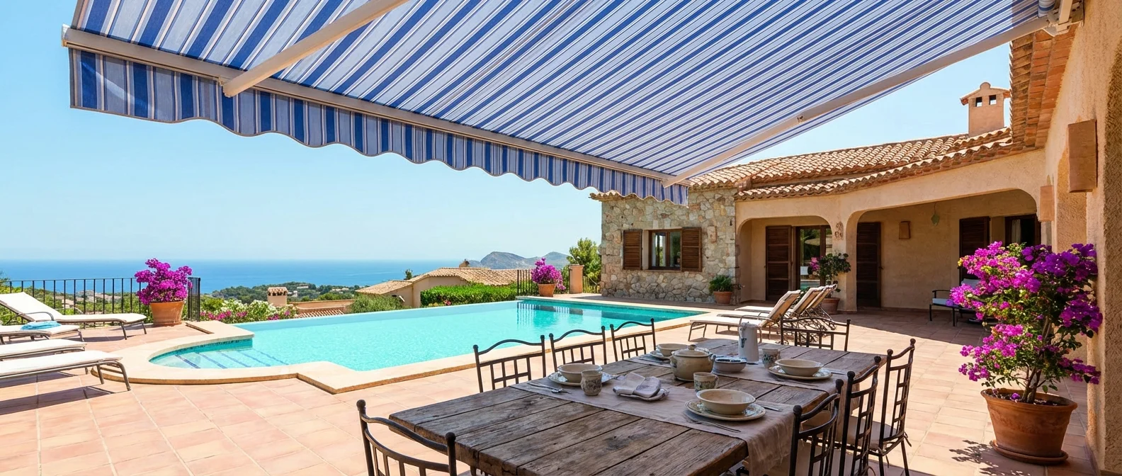 Toldos retráctiles para su hogar en la Costa Blanca. Opciones motorizadas y manuales, sensores de viento y tejidos anti-UV. La solución de sombra más popular en España — instalación profesional.